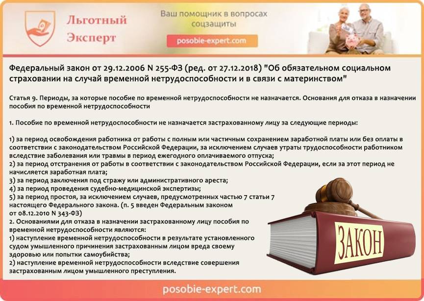 Заявителю может быть отказано в оплате больничного. По тому же закону №255-ФЗ в следующие периоды не производится оплата: