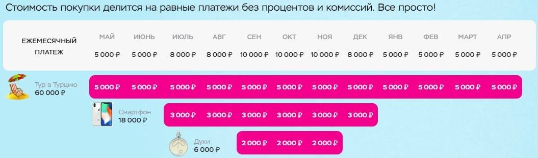 Рассмотрим на конкретном примере расчет платежей при приобретении товара. Рассчитывается сумма платежа, которая будет списана с баланса, элементарно. Для всех покупок действует одна схема: их стоимость суммируется и делится на количество месяцев. Единожды за период нужно выплачивать по одной части.