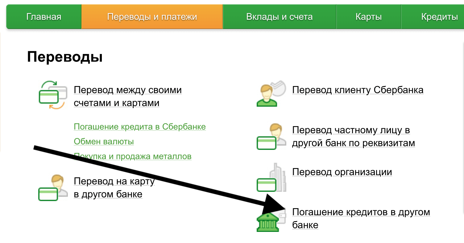 - В интерфейсе Сбербанк онлайн нужно найти раздел «Платежи и переводы», затем выбрать подраздел «Погашение кредитов в другом банке».
