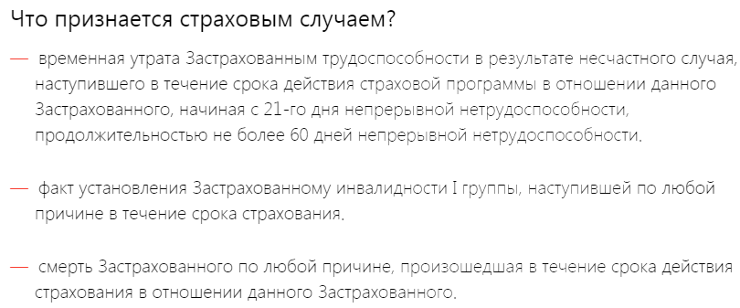 Банк настоятельно рекомендует оформить программу страхования от наступления недееспособности или преждевременной смерти клиента, гарантируя страховую выплату и ликвидацию долга при условии соответствия заемщика следующим параметрам: