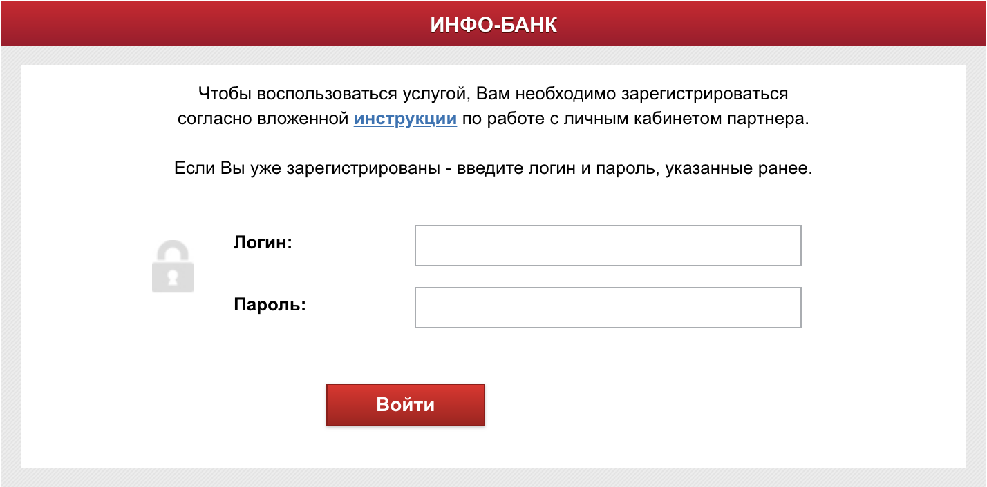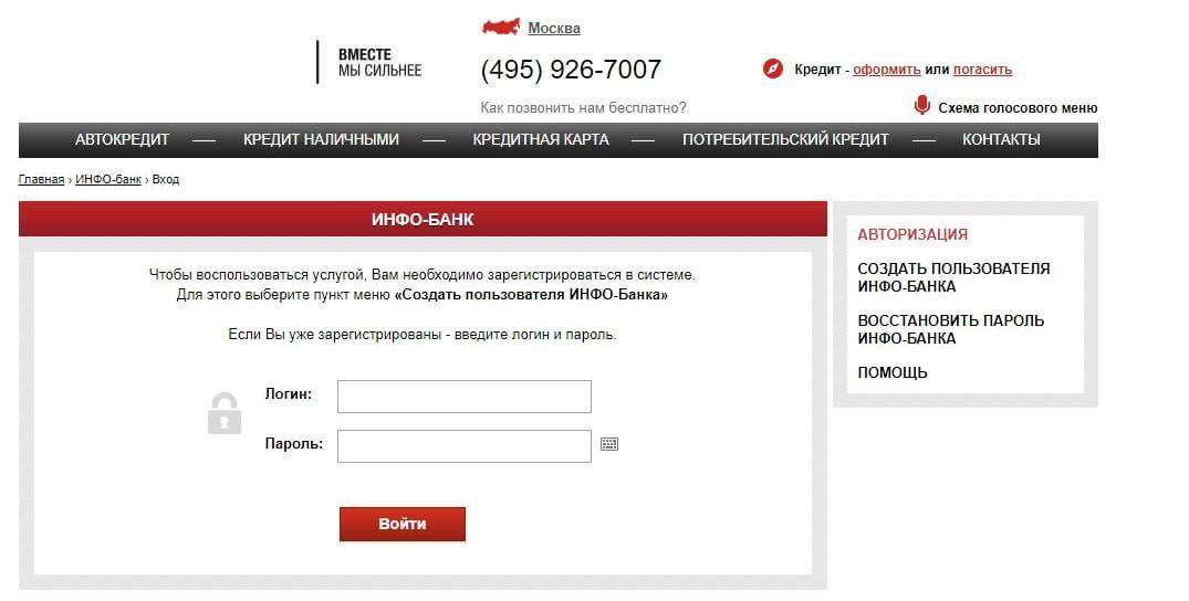- Нажмите кнопку «Войти в Инфо-Банк» и введите в специальном поле логин и пароль (для физических лиц — https://infobank.rusfinance.ru/ICA/login.jsp);