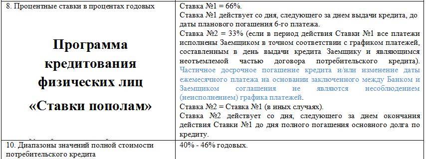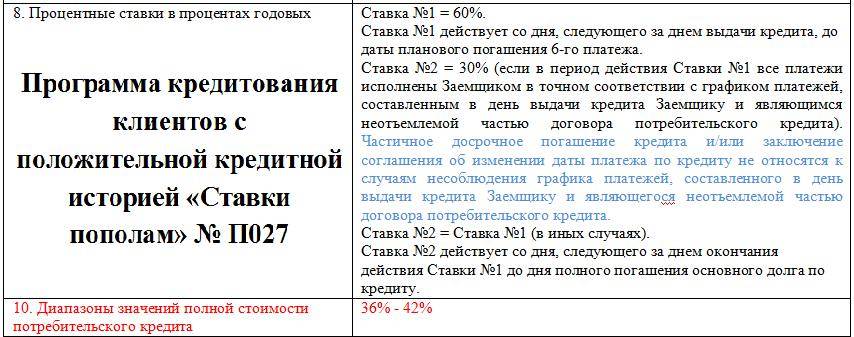 Как видно из программ, диапазон значений полной стоимости составляет 40%-46% годовых для обычного клиента и 36% — 42% для повторного и зависит от индивидуальных особенностей оформления и погашения кредита.