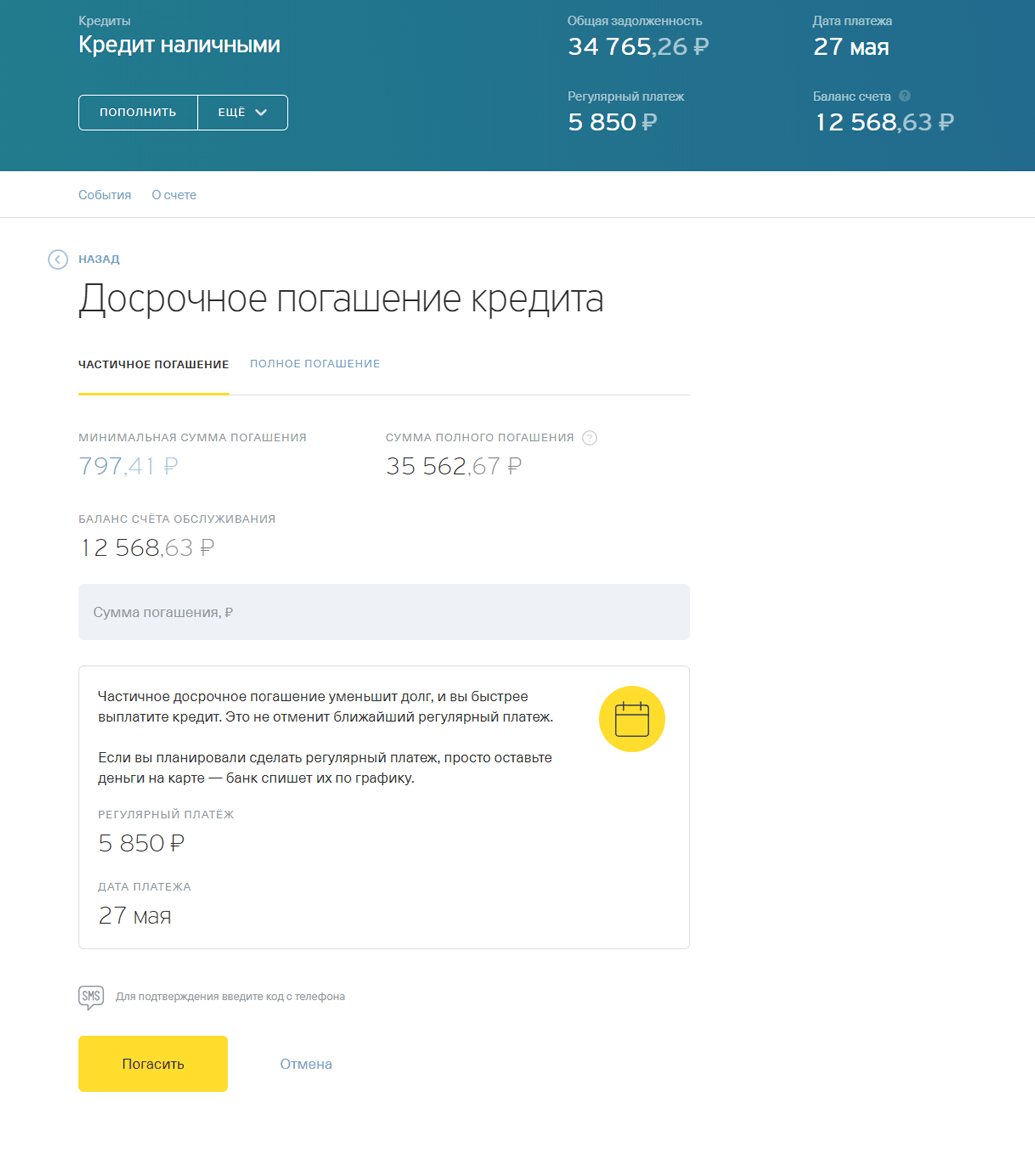 Пример информации в Личном кабинете интернет-банка о том, сколько осталось заплатить при кредите наличными