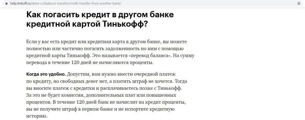 Суть заключается в том, что с кредитных карт банка с помощью чата поддержки можно бесплатно отправить весь кредитный лимит (или его часть) в другие кредитные организации на свои счета, тем самым погасив там задолженность (или не совсем задолженность), и переведя ее в «Тинькофф Банк», при этом не нужно платить банку проценты в течение 120 дней с момента этого перевода.