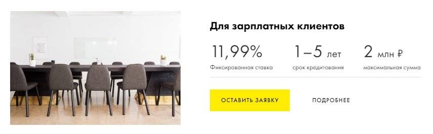 Клиентам, участвующим в зарплатном проекте, банковская компания выдвигает более лояльные требования. Им не нужно предоставлять справку о доходах, а минимальный стаж должен составлять 3 месяца вместо 6.