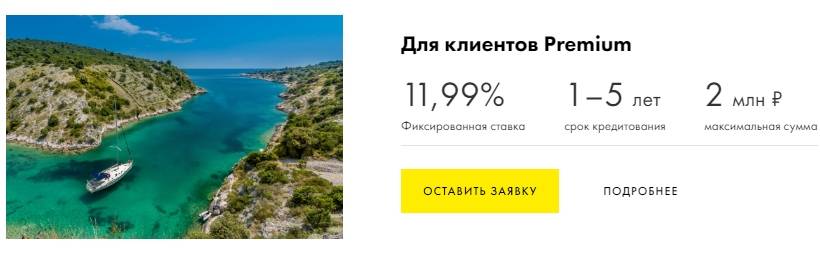 Программа Преиум кредитования предоставляет более расширенные услуги физическим лицам – фиксированную ставку в размере 10,99% на сумму от 250 000 рублей.