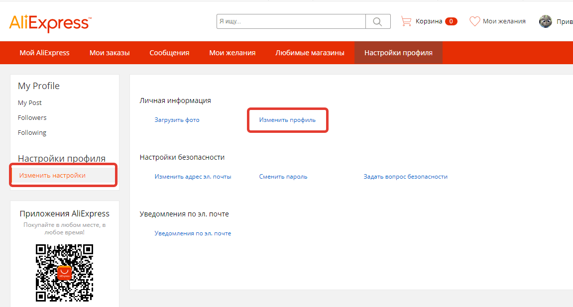 В личном кабинете переходим в раздел «Настройки профиля»-«Изменить настройки»-«Изменить профиль»