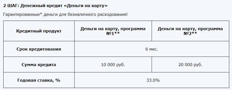 - Сумма — 10 000 рублей. Срок кредитования — 6 или 9 месяцев. Процентная ставка — 48% годовых.