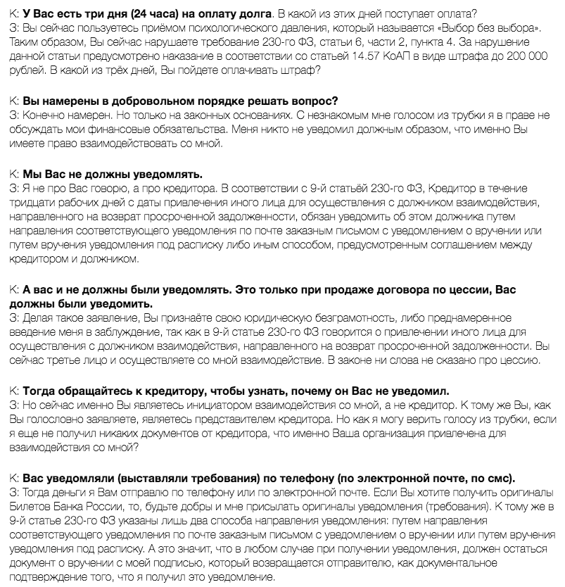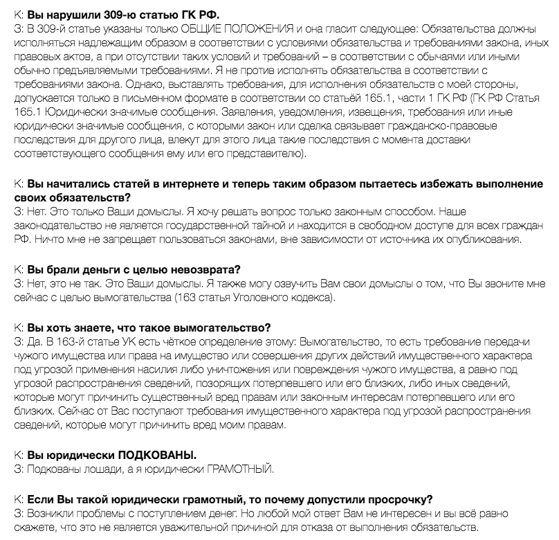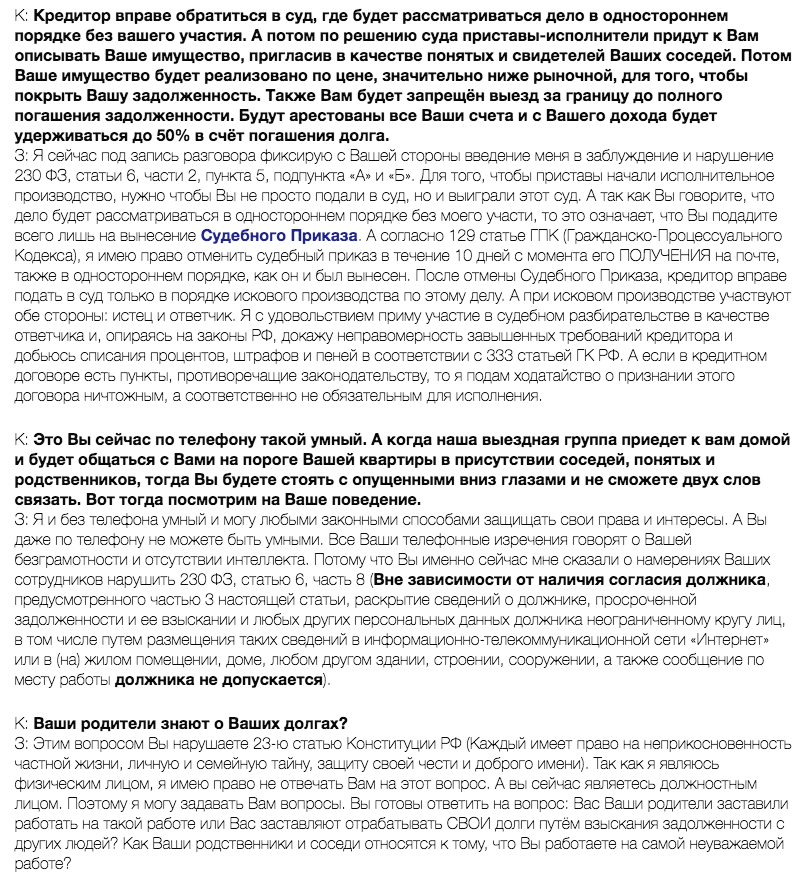 Пример того, какие вопросы могут задавать коллекторы и как на них можно правильно ответить: