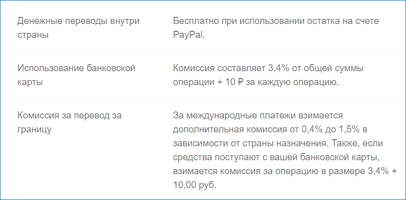 - За транзакции внутри страны через PayPal, когда деньги списываются с привязанной карты, вознаграждение в пользу площадки составляет 3,4% от суммы транзакции + 10 рублей.