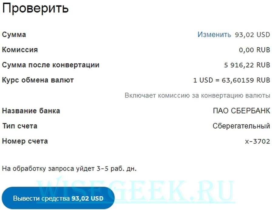 После подтверждения принадлежности карты предоставляется возможность указания суммы для вывода. При повторной заказе средств подтверждения доступа к карте не потребуется. Минимальный порог для вывода — 300 рублей. Обычно верификация «пластика» проводится бесплатно. Однако для граждан, которые работают с крупными суммами (обычно это коммерческие аккаунты) допускается одноразовое списание за проверку счета. Ставка составляет 60 рублей. Для других стран такса устанавливается по-другому.