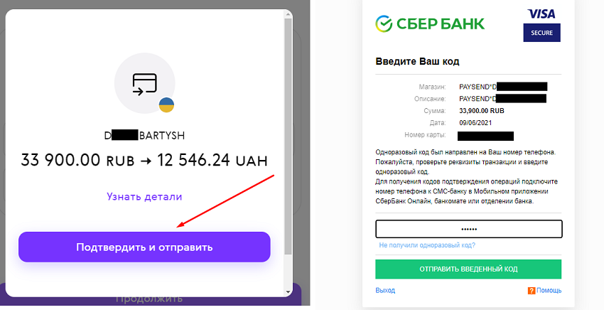 - Ознакомиться с комиссией, конвертацией в гривны и подтвердить операцию.