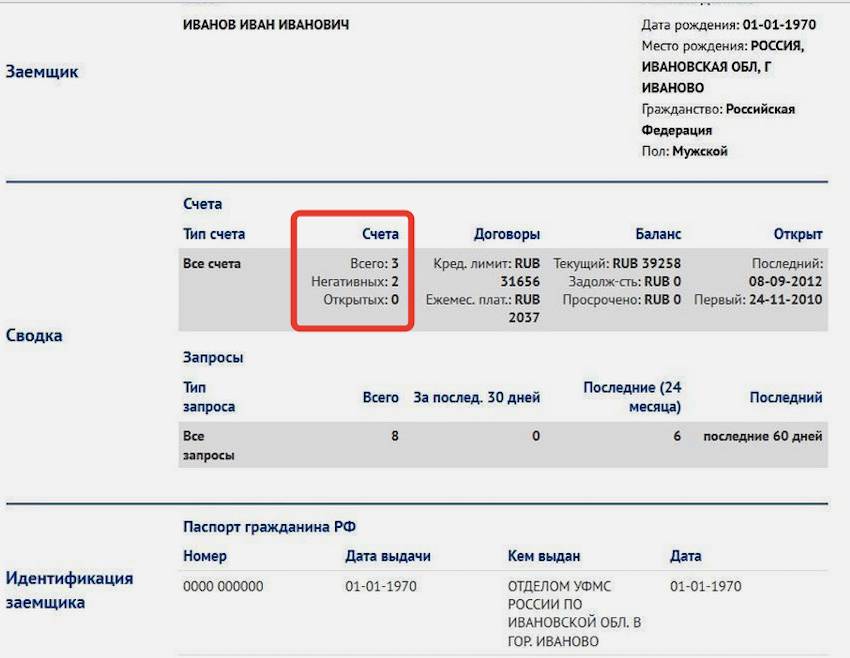 Образец выписки о кредитной истории. В частности, здесь указываются количество всех займов и негативных.