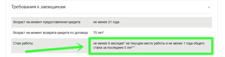 - официальное трудоустройство на текущем месте работы должно быть не менее 6 месяцев (общий стаж – как минимум 1 год за последние пять лет).