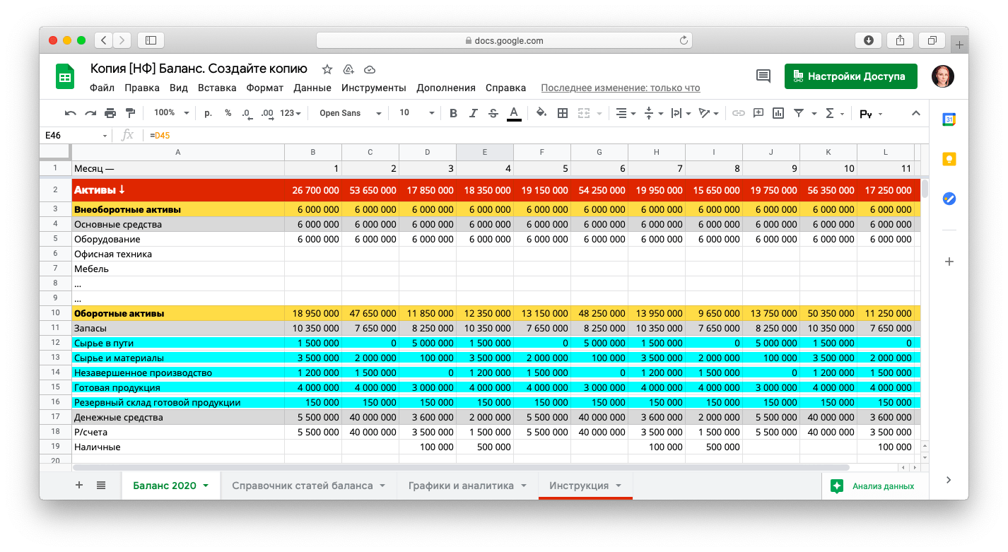 В чем хранятся деньги, можно увидеть в разделе «Активы», а сколько денег заморожено в товаре видно в разделе «Оборотные средства — Запасы». Тут же можно посмотреть, сколько денег заморожено в сырье, материалах, готовой продукции и незавершенных производствах. Скачайте шаблон отчета «Баланс» →