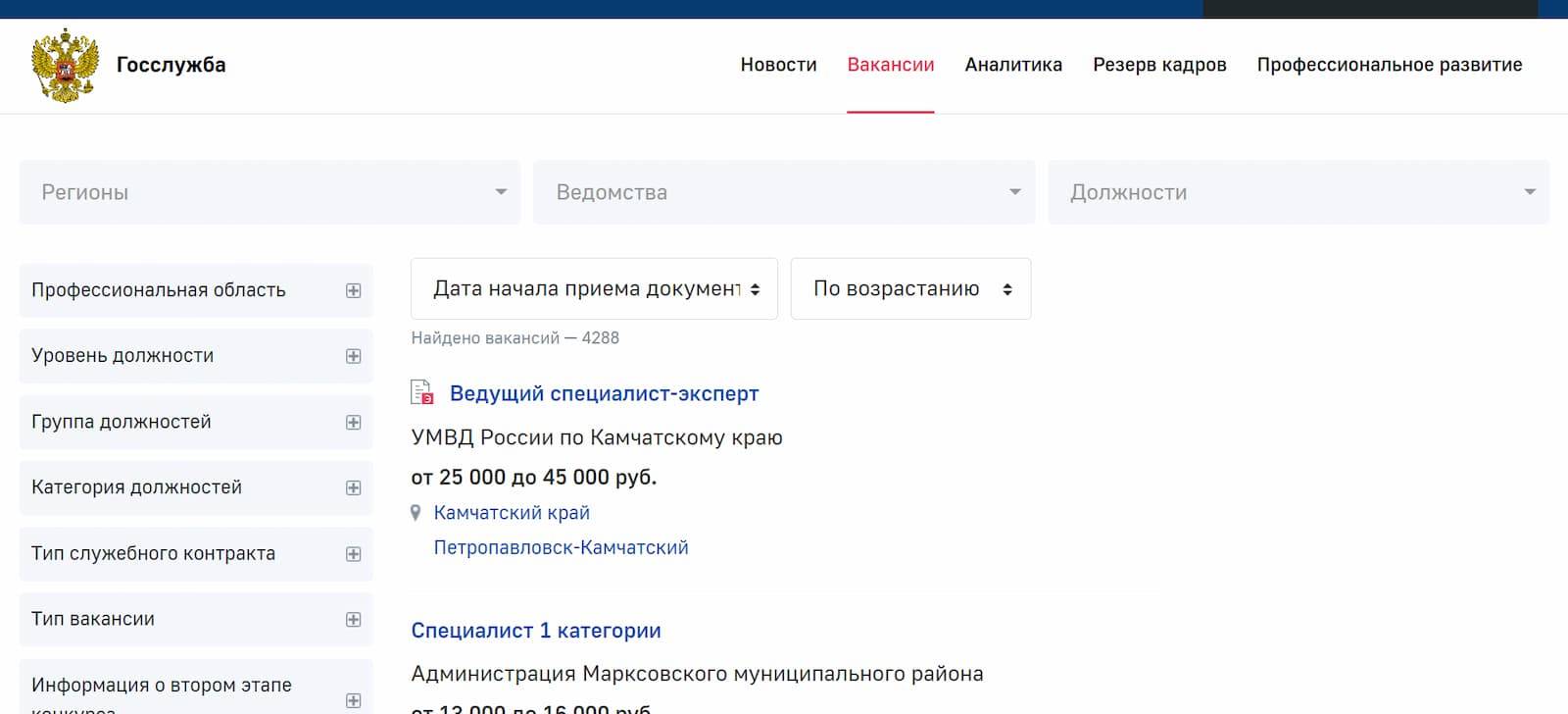 Сайт «Госслужба» — это единая общероссийская база вакансий для гражданских и муниципальных служащих. Здесь представлены вакансии для секретарей судебных заседаний, специалистов «Роспотребнадзора», налоговых инспекторов и др. Соискатели могут не только просматривать и откликаться на вакансии, но и пройти тест, который поможет оценить их готовность к поступлению на государственную службу.