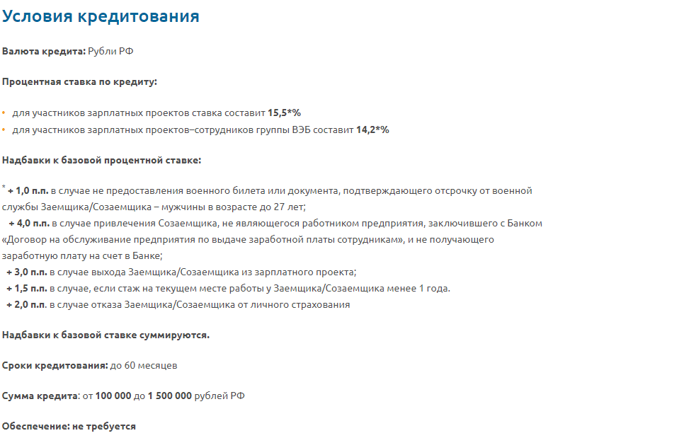Дополнительные комиссии за обслуживание ссуды не предусмотрены. Заем отличается отсутствием целевого предназначения на расходование полученных средств.