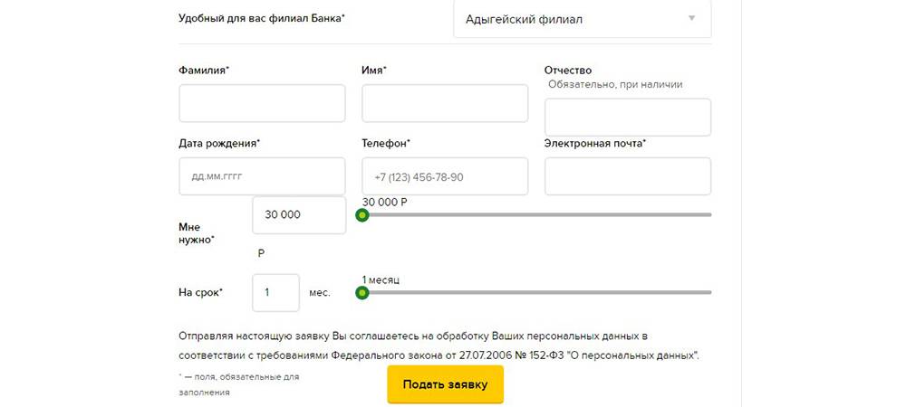 Если условия кредитования вас устраивают, можно переходить к оформлению электронной заявки. Кнопка отправки анкеты находится рядом с кредитным калькулятором. Потенциальный заемщик должен указать: