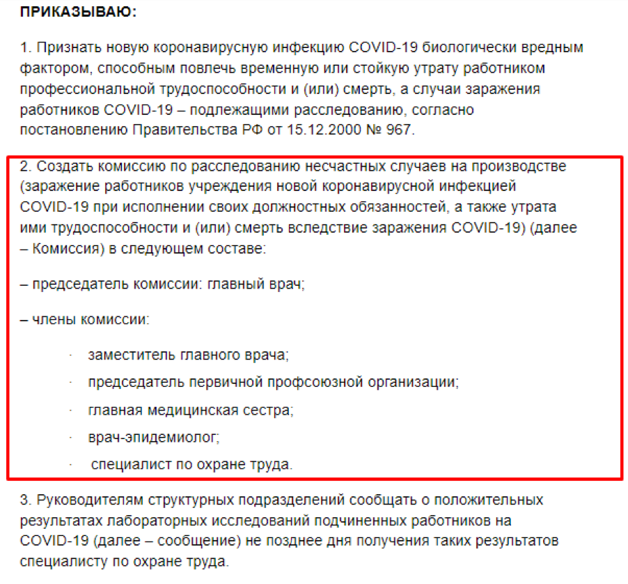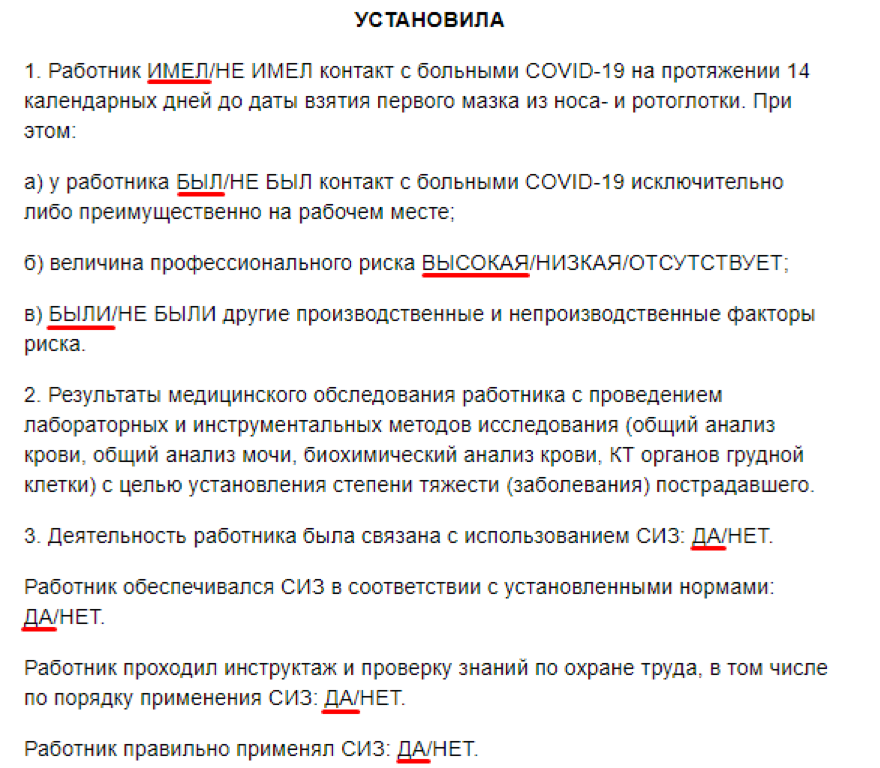 1 июня 2010 года в клинику пришло уведомление о наличии коронавируса у одного из врачей. В этот же день руководитель создал комиссию. Спустя сутки, 2 июня, было завершено расследование несчастного случая. На следующий день акт подписали члены комиссии, сотрудник и работодатель, а затем отправили пакет документов в ФСС. 4 июня пострадавшему была переведена страховая выплата.