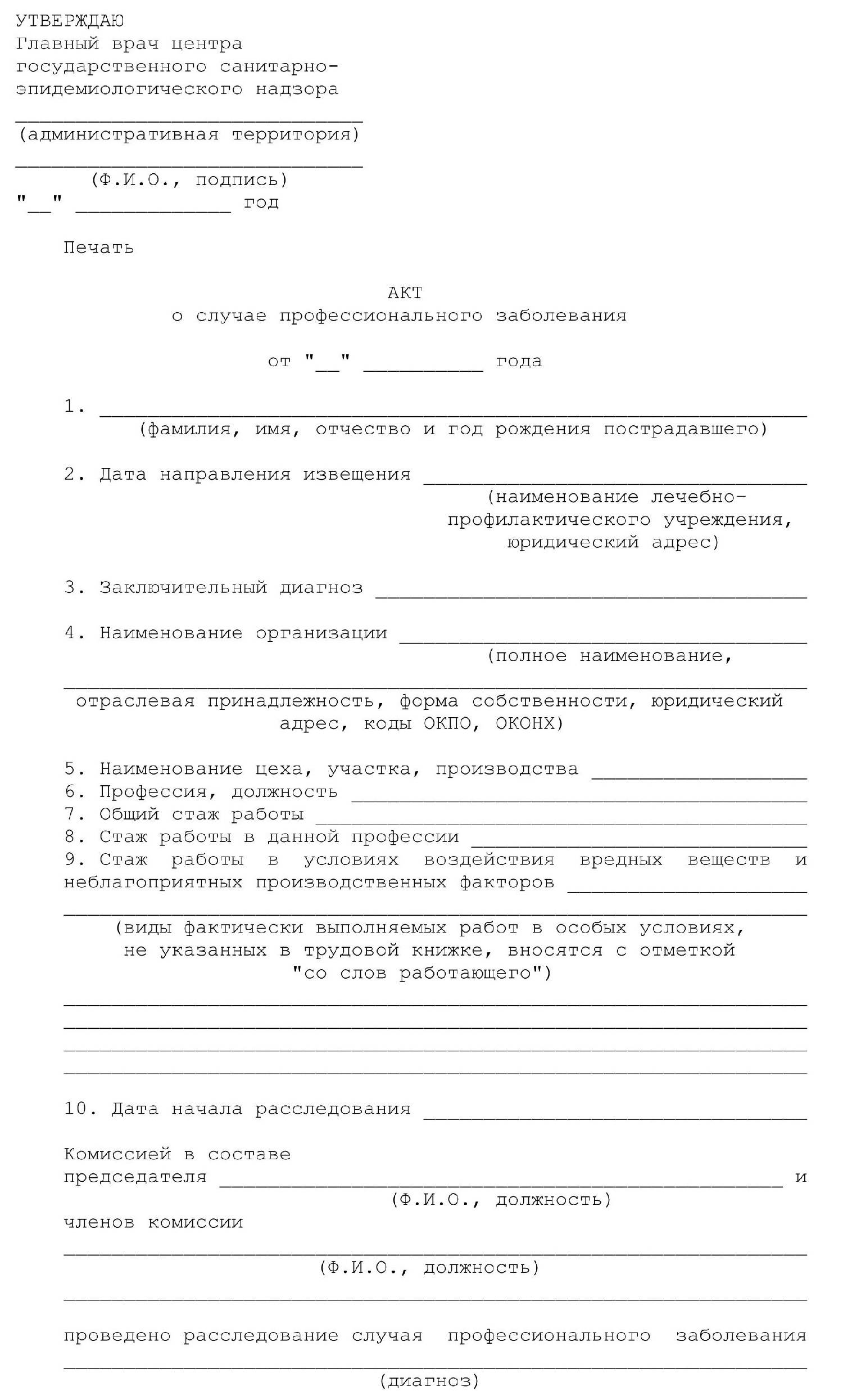 В результате расследования составляется акт по форме, утвержденной в Постановлении Правительства РФ от 15.12.2000 № 967. На его основании работодатель затем издает приказ о мерах, препятствующих возникновению профессиональных заболеваний. Акт составляется в течение трех дней с момента завершения расследования в пяти экземплярах. Они передаются:
