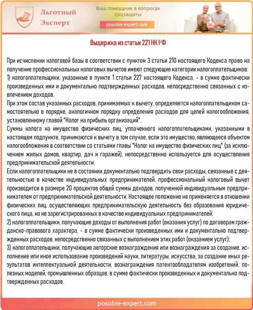 Если доход по гражданско-правовому договору физическое лицо получило не от налогового агента, а, например, от заказчика — физического лица, который не является ИП, профессиональный вычет можно получить, подав налоговую декларацию по форме 3-НДФЛ по окончании года в налоговый орган (абз. 6 п. 3 ст. 221, п. 1 ст. 226 НК РФ).