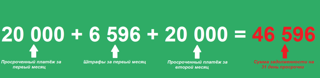 А через месяц, после того, как наступит дата следующего платежа, проценты будут начисляться уже на 46 956 руб. (20 000 платёж за первый мес + 6 596 ру штрафы за первый мес + 20 000 платёж за второй мес) .