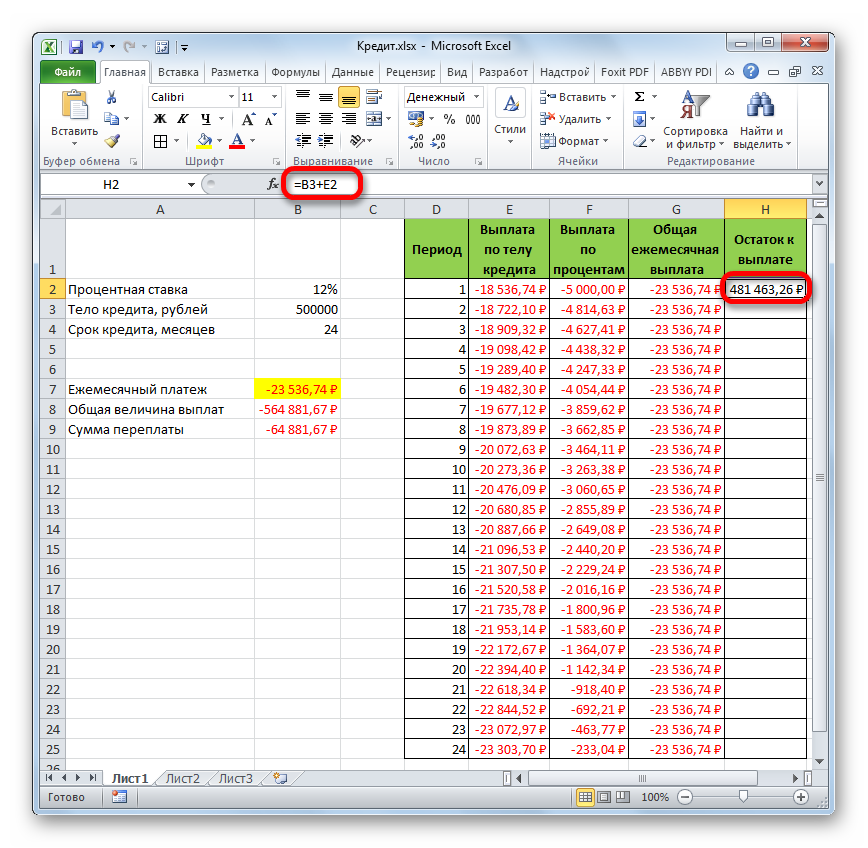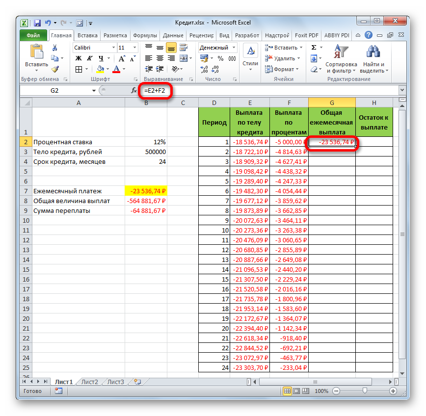 - Рассчитать общую ежемесячную выплату, сложив значения в двух предыдущих столбиках.