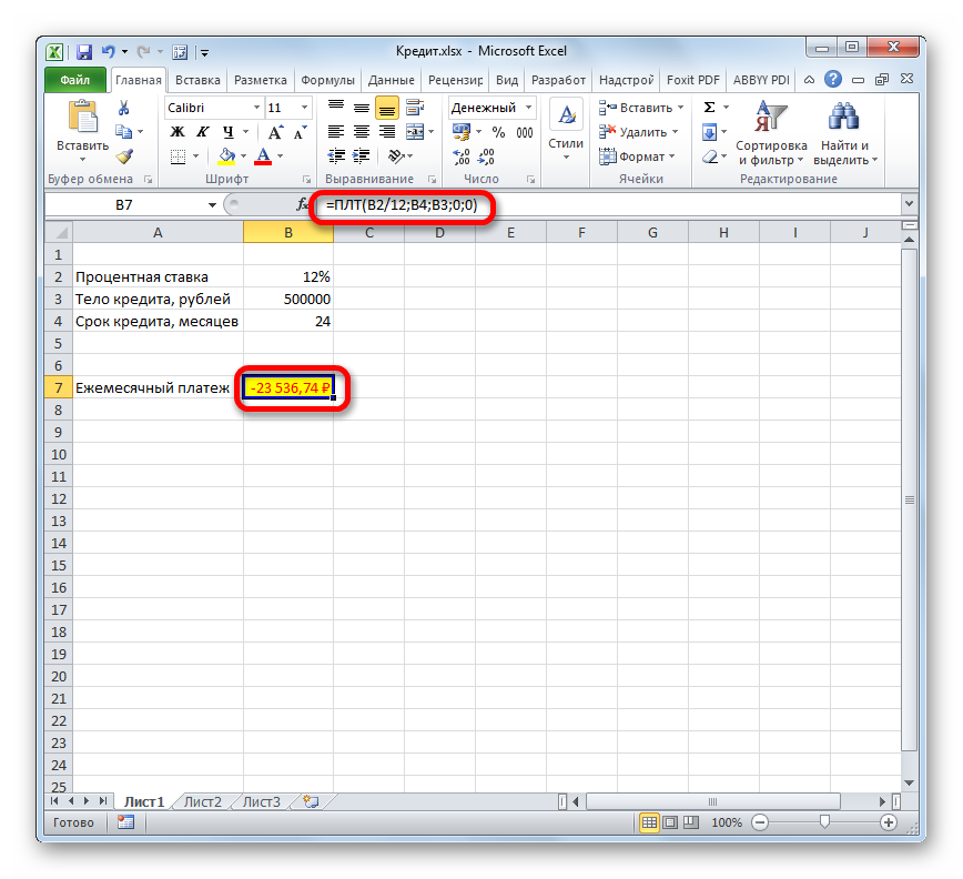 Финальный результат. Ежемесячный платёж посчитан и выделен красным цветом