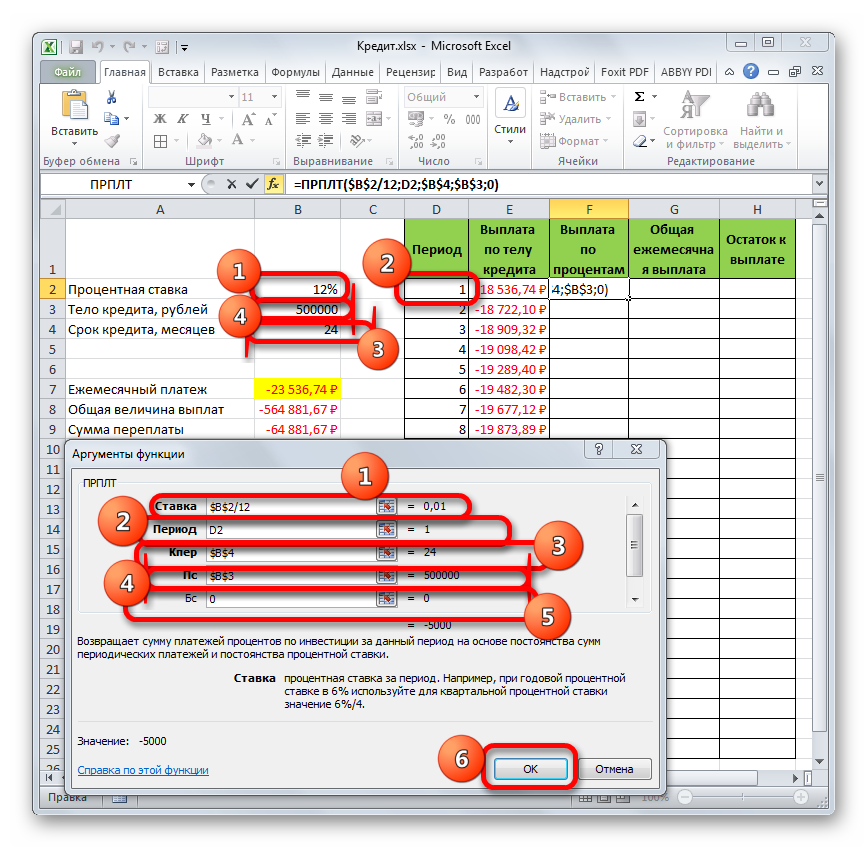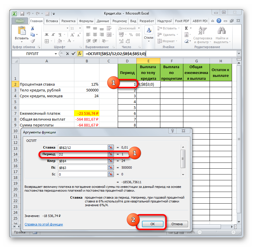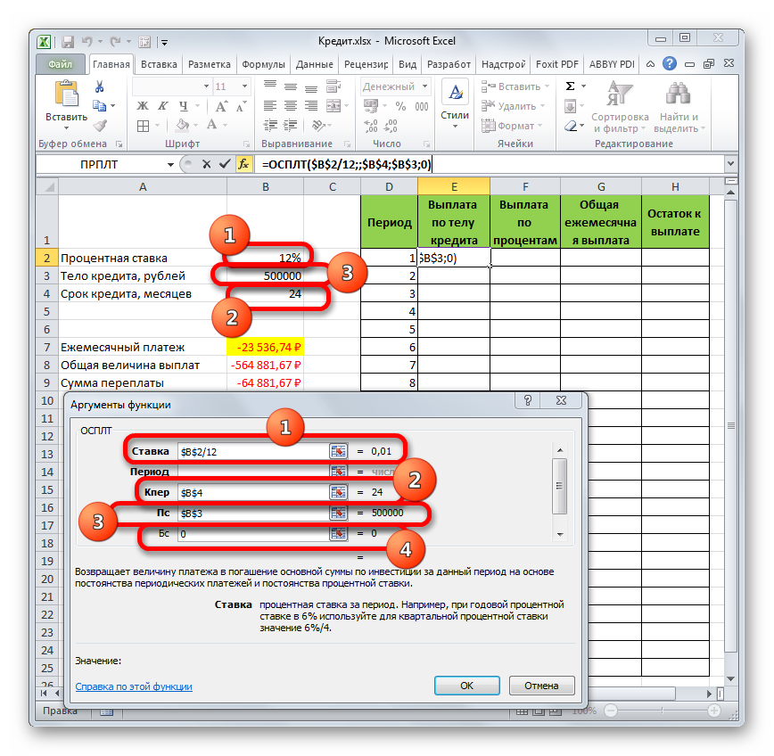 Кстати, обратите внимание на значение функции, обозначенное на рисунке под номером 2: =ПЛТ(C5/12;C6;-C4). Да, да, это и есть те самые координаты, которые мы вводили в таблицу, выбрав функцию «ПЛТ». По сути, вы могли бы не проделывать всех тех сложных телодвижений, которые показаны на втором и третьем рисунках