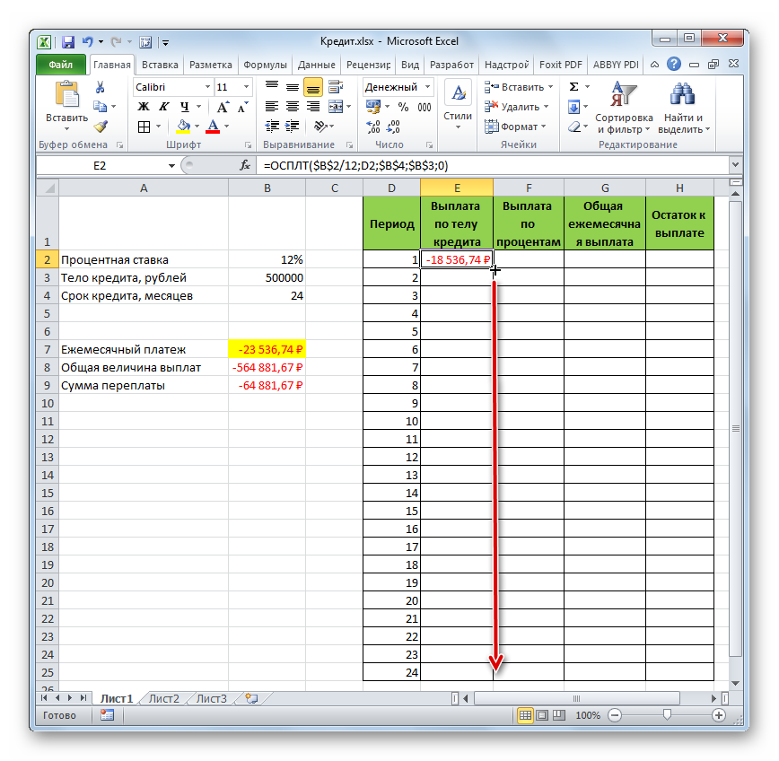 - Проверить, что первая ячейка в графе «Выплата по телу кредита» заполнилась.