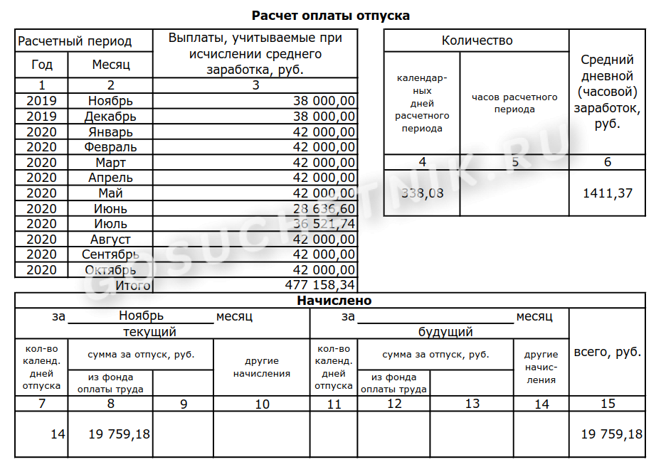 | Сумма отпускных | = | Средний дневной заработок | Х | Кол-во дней отпуска |