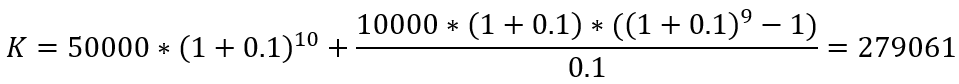 Сначала находим конечную сумму по формуле сложного процента с регулярными пополнениями:
