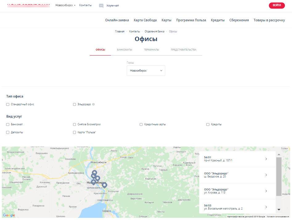 На сайте банка представлена карта для поиска ближайшего офиса в своем городе