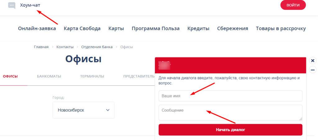 Расположение на сайте для связи с банком