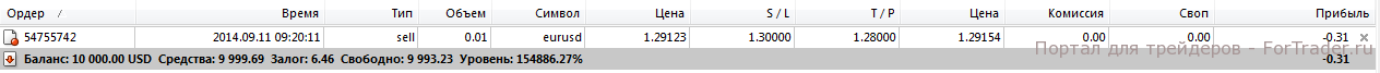 Рис. 1. Пример открытой сделки на стандартном счете с минимальным торговым лотом.