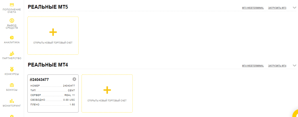 Когда в будущем захотите открыть еще один аккаунт у этого брокера, заново регистрироваться не придется. В личном кабинете отображаются все открытые счета, для создания нового достаточно просто нажать «Открыть новый торговый счет», выбрать его тип и задать детали (плечо, валюта).