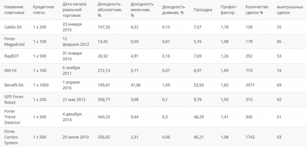 Информация о зарубежных советниках Форекс представлена в такой таблице: