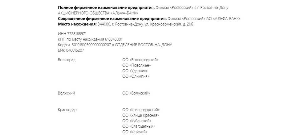Фирменное название: Ростов-на-Дону, филиал «Ростовский», АО «Альфа-Банк». Реквизиты: КПП 616343001, БИК подразделения 046015207, корсчет 30101810500000000207.
