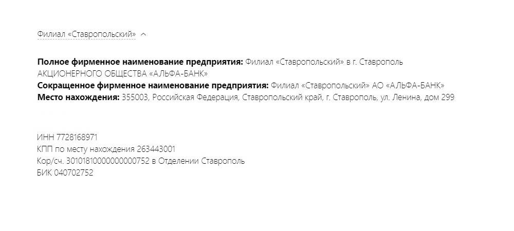 Наименование: Ставрополь, филиал «Ставропольский», АО «Альфа-Банк». Реквизиты: КПП подразделения 263443001, БИК 040702752, корсчет 30101810000000000752.