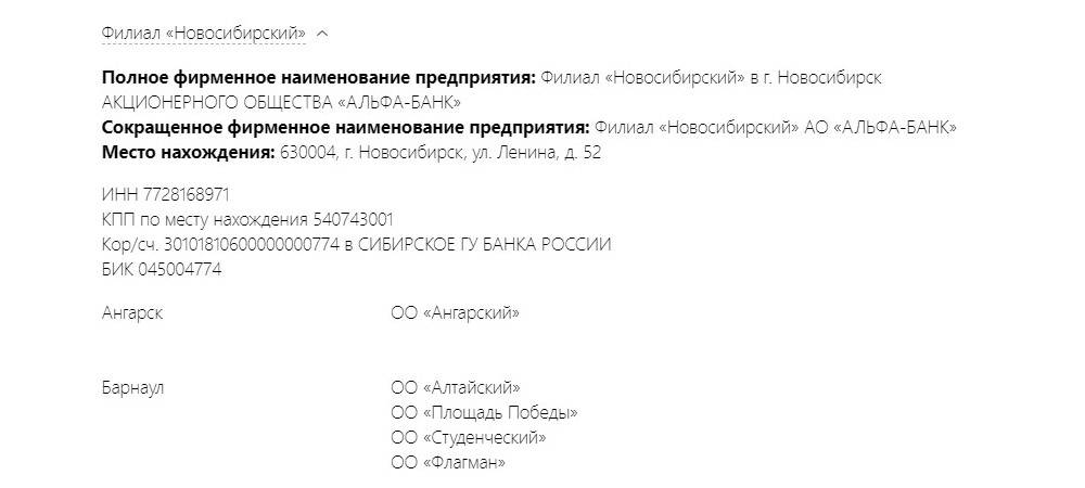 Фирменное название: Новосибирск, филиал «Новосибирский», АО «Альфа-Банк». Реквизиты отделения: корсчет 30101810600000000774, КПП 540743001, БИК 045004774.