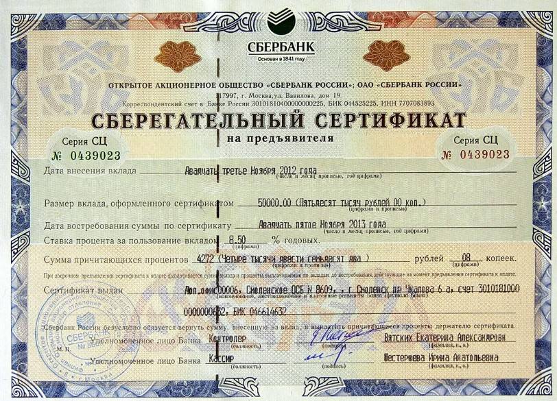 Затем, попав к оператору, предъявить ему гражданский паспорт РФ, указать сумму будущего вклада и срок хранения. Оператор заполнит соответствующий бланк, с которым нужно будет пройти в кассу. Кассиру передается бланк, положенная сумма денег, а он выдает оформленный сертификат и чек об оплате. У банка хранится корешок сберегательного документа с указанием персональных данных владельца, заверенный его подписью.