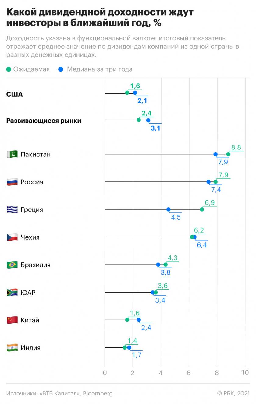 Более высокий показатель среди развивающихся стран зарегистрирован только в Пакистане — 8,8%. Дивидендная доходность превышает 6% в Греции (6,9%) и Чехии (6,2%). В среднем по развивающимся странам показатель составляет 2,4%, а в США — 1,6%, сообщает РБК со ссылкой на отчет «ВТБ Капитала».