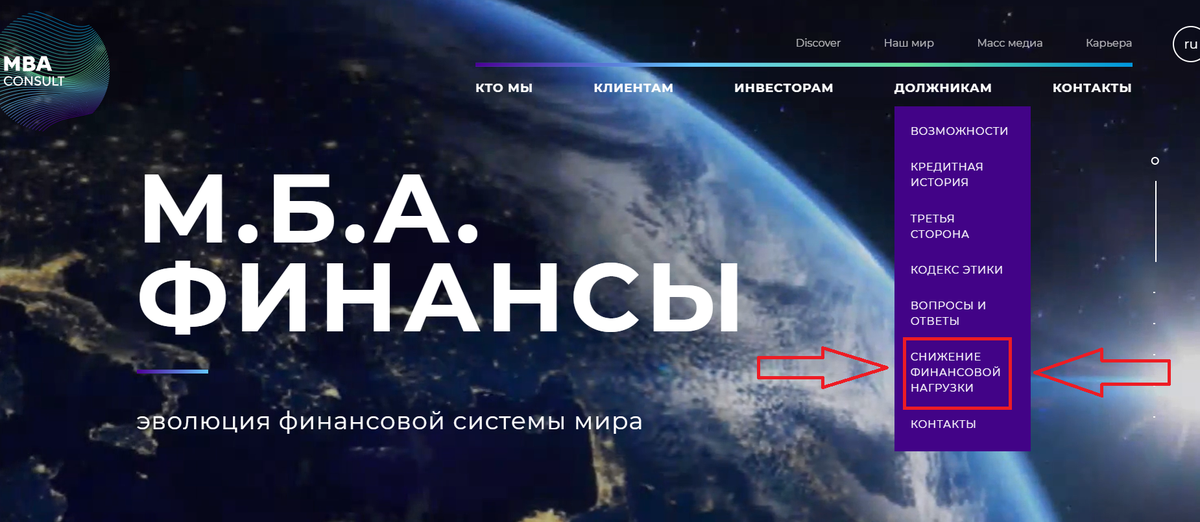 - Зайти на сайт взыскателя https://mbacgroup.ru/ и в выпадающем меню раздела «Должники» найти вкладку «Снижение финансовой нагрузки».