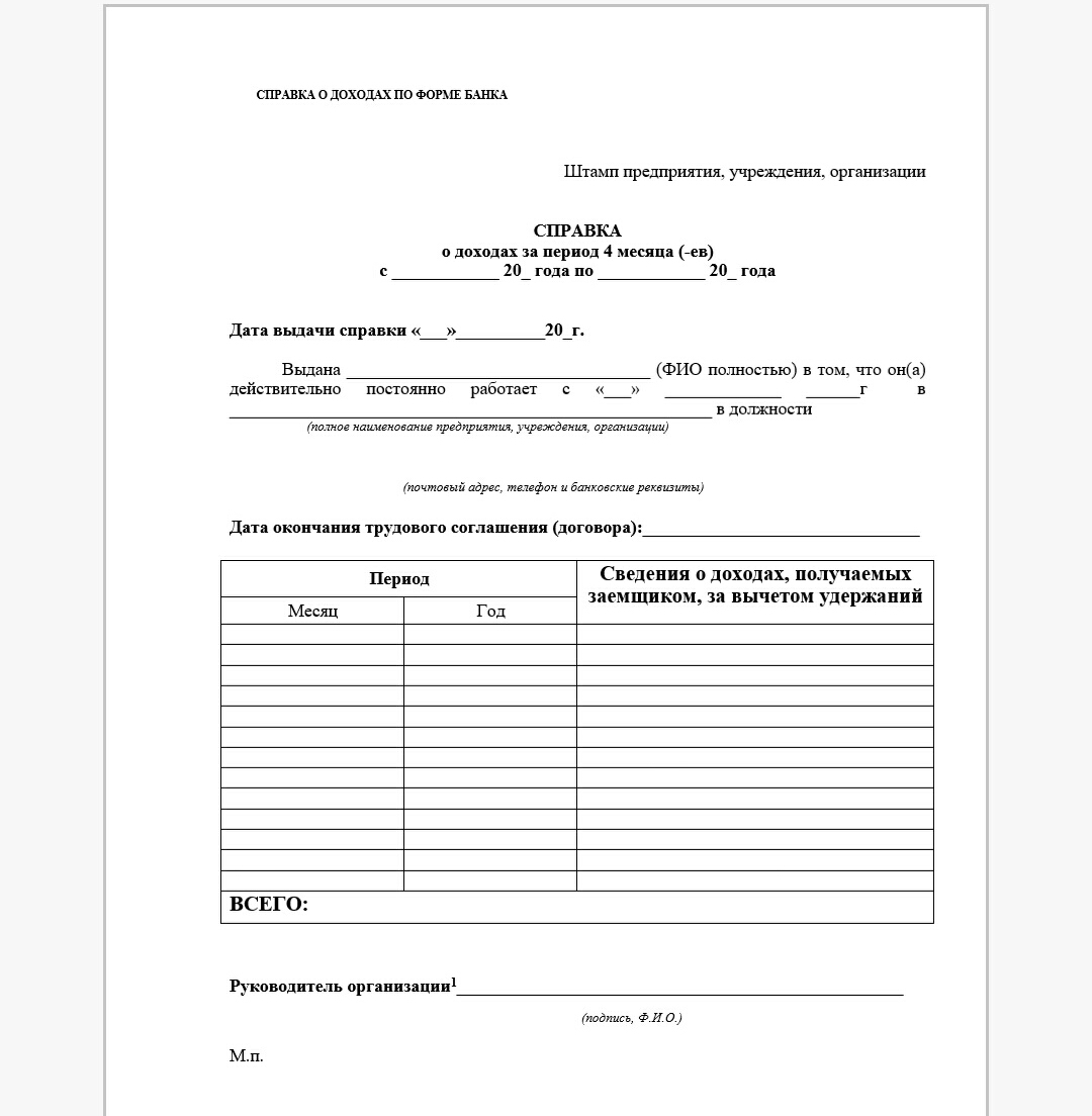 - Подтверждение дохода: 2-НДФЛ, 3-НДФЛ, справка по форме банка или справка в свободной форме