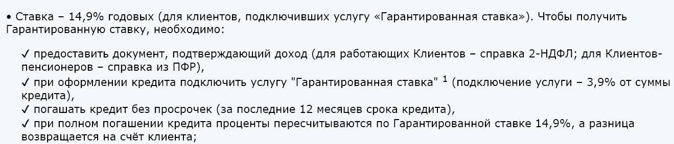 Предложение будет актуально для пенсионеров, желающих оформить кредит в несущественном размере — 5000 — 40000 рублей. Кредит выдается под повышенный процент – ориентировочно от 25% от 35% годовых. Минимальная ставка одобряется при соблюдении требований услуги «Гарантированная ставка». Дополнительно можно оформить скидку в 5% на тех же условиях, что и в программе «Пенсионный плюс».