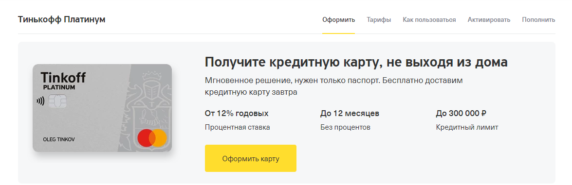 - большой кредитный лимит: от 15 000 до 600 000 рублей;срок оформления до двух дней. Необязательно идти в офис — по территории России курьер доставит карту вам домой бесплатно. Получить кредитку можно и за границей, подав заявку онлайн;