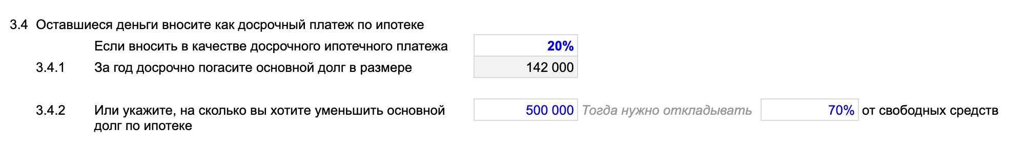 Кстати, цель можно ставить и от обратного: например, какую долю свободных средств мне стоит направлять на досрочные платежи, чтобы за год уменьшить основной долг на желаемую сумму. Это строка 3.4.2