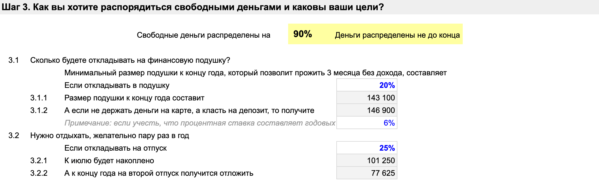 Как только вы укажете, какой процент от свободных средств направите на подушку, на вкладке «Гайд» в шаге 3.1.1 рассчитается сумма вашей подушки на конец года. Если держать все деньги на пополняемом депозите, то сумма будет немного больше. Это значение будет рассчитано в шаге 3.1.2.