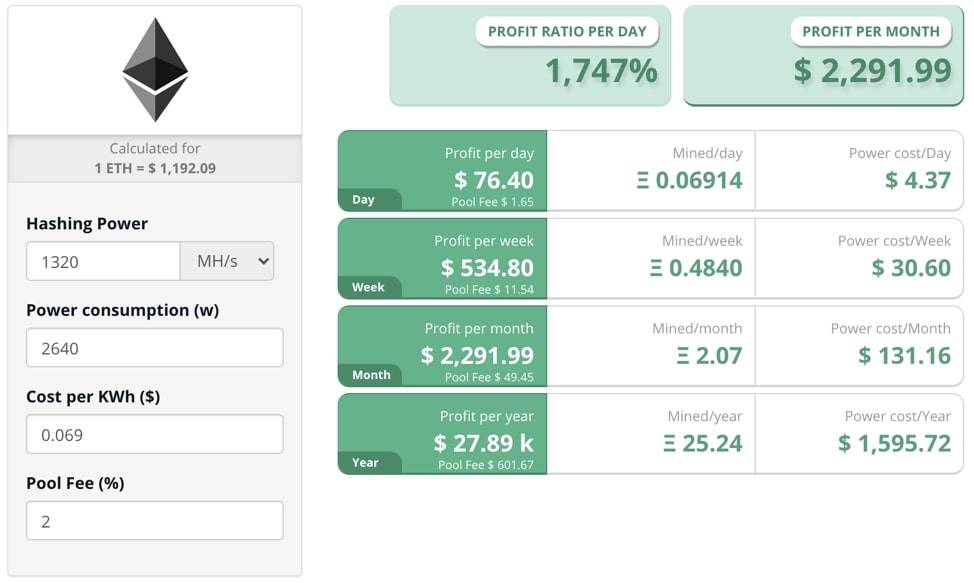 22 карты 1080 Ti будет приносить по 1730 долларов в месяц с электричеством по 252 доллара. Видим, на Биткоине 22 асика будут приносить по 500 долларов в месяц, еле окупая потребление электричества.