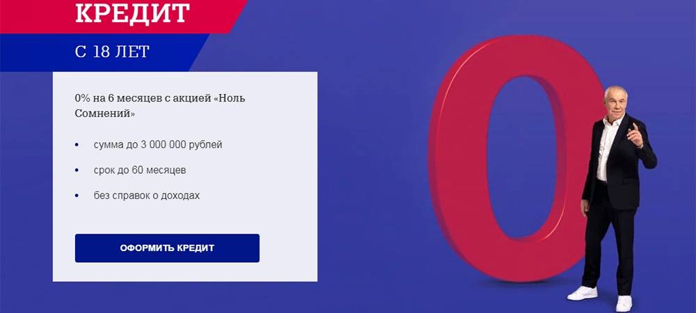 Специальные условия для пенсионеров действуют и для другого кредитного продукта. С опцией «Ноль сомнений» (подробнее здесь) можно взять в кредит от 20 тыс. до 4 млн руб. под 0% на первые 6 месяцев.